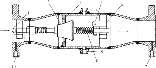 2 線性孔板流量計(jì)工作原理 線性孔板又稱(chēng)彈性加載可變面積可變壓頭孔板,其環(huán)隙面積隨流量大小而自動(dòng)變化,曲面圓錐形塞子在差壓彈簧力的作用下來(lái)回移動(dòng),環(huán)隙變化使輸出信號(hào)(差壓)與流量成線性關(guān)系,并大大地?cái)U(kuò)大范圍度,其結(jié)構(gòu)如圖3.3所示。