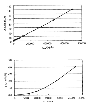 統(tǒng)創(chuàng)公司對(duì)線性孔板進(jìn)行逐臺(tái)標(biāo)定是以水為介質(zhì),不同口徑得線性孔板均選擇14個(gè)標(biāo)定點(diǎn),其中流量較小時(shí),標(biāo)定點(diǎn)排得較密,圖3.4所示為一臺(tái)DN200線性孔板得標(biāo)定曲線。圖中的差壓?jiǎn)挝粸?/FONT>inH2O,(linH2O=249.0889Pa),表3.1所列的是一臺(tái)DN200的線性孔板的實(shí)際標(biāo)定數(shù)據(jù),其中從體積流量換算到質(zhì)量流量是建立在水的密度p=998.29kg/m3基礎(chǔ)上的。
