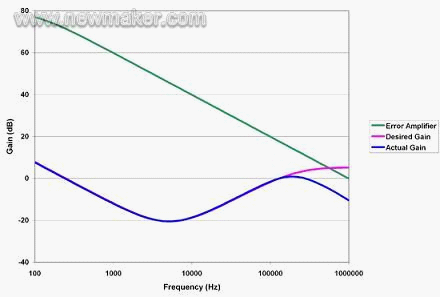 第二種常見錯誤是讓放大器提供超出其能力范圍的增益,圖2描述了這種錯誤。它顯示了理想的誤差放大器頻率響應、放大器的增益以及給定誤差放大器限制的預計性能。由于其帶寬限制的存在,放大器無法給出理想的高頻增益。盡管圖中未能顯示,但相位也受到嚴重的影響。電壓模式轉換器(如圖1所示)中需要高頻大增益,這時問題會更加突出。設計誤差放大器補償時,請?zhí)貏e注意其帶寬限制,否則您最終需要使用一個震蕩電源。