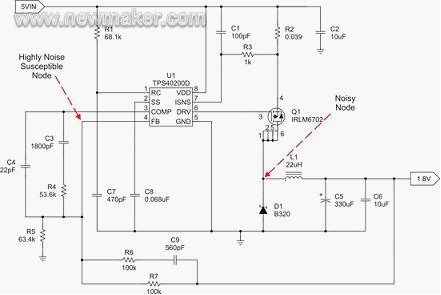 最嚴重的寄生電容問題通常會涉及反饋(FB)電壓以及誤差放大器補償節(jié)點的布局。這是由于誤差放大器輸入的高阻抗、誤差放大器的高增益,以及大量連接至該節(jié)點的組件。圖1顯示了典型控制器中出現(xiàn)這一問題的位置,以及一個較為可能的耦合節(jié)點。Q1和D1之間的連接約有0.1V/ns到1V/ns的極高轉換速率,并且會形成僅1pF寄生電容的1mA電流。