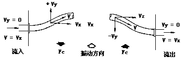 當流體質點有進口流入圖示振動方向的測量管時,流體質點的垂直流動速度為+Vy,同樣在流體質點流向出口時,其垂直流動速度為-Vy。由此可以推出,流體質點在通過振動的測量管時,垂直方向的速度是一個從零逐漸加大,直到中間最大,再逐漸減小到零的過程。由力學原理可知,速度的變化是由加速度引起的,而加速度是力作用于其上的結果。根據這個原理,稱這個垂直速度變化為科氏加速度Ac,因此作用于流體質量M上的科氏力為Fc=Mac。在測量管上與中心距離相等的兩點上,作用的科氏力大小相等,方向相反。