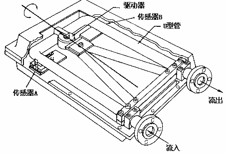 在商品化產品設計中,通過測量系統(tǒng)旋轉產生科氏力是不切合實際的,因而均采用使測量管振動的方式替代旋轉運動。以此同樣實現科氏力對測量管的作用,并使得測量管在科氏力的作用下產生位移。由于測量管的兩端是固定的,而作用在測量管上各點的力是不同的,所引起的位移也各不相同,因此在測量管上形成一個附加的扭曲。測量這個扭曲的過程在不同點上的相位差,就可得到流過測量管的流體的質量流量。