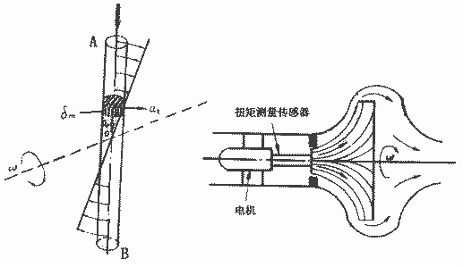 早期設計的科氏力質量流量計的結構如圖2所示。將在由流動流體的管道送入一旋轉系統(tǒng)中,由安裝在轉軸上的扭矩傳感器,來完成質量流量的測量。這種流量計只是在試驗室中進行了試制。