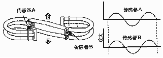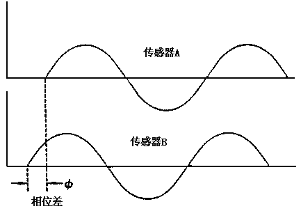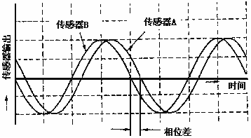 隨著振蕩運動的進行,測量管被周期性地分開、靠攏,科氏力也周期性地作用在兩根測量管上,通過安裝在測量管上的位移創(chuàng)按其A、B,測出由科氏力引起的測量管相對位置的變化,通常轉化為測兩點的相位差,如圖7所示。這個相位差的大小與質量流量成正比。