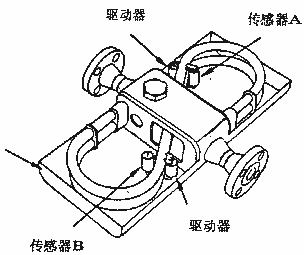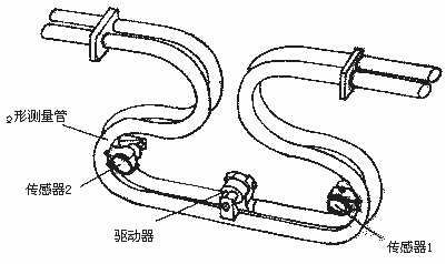 如圖3所示,這種流量計的測量系統(tǒng)由兩根平行的S形測量管、驅動器和傳感器組成。管的兩端固定,管的中心部位裝有驅動器,使管子振動。在測量管對稱位置上裝有傳感器,在這兩點上測量振動管之間的相對位移。質量流量與這兩點測得的振蕩頻率的相位差成正比。