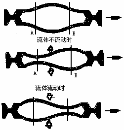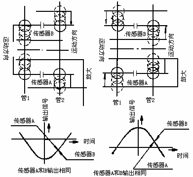 如圖23a,當管子分開時,在振點前的流體中產生的科里奧利力與振動力方向相反,減慢管子的運動速度;而在振點之后管中流體產生的科氏力與振動方向相同,加快管子的運動速度。當驅動器使管子靠近時,如圖23b,則產生相反的結果。在A、B兩點的傳感器可測的兩處管字運動的相位差,由此可得到流過測管中流體的質量流量。