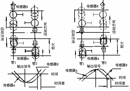 當測量管內的流體流動時,在驅動其振動的某一方向上,科氏力產生的反作用力在測量管上的影響結果如圖14所示,管1分開和管2靠近時,管1上部運動加快,下部減慢,管2則在相反的方向上同樣上部加快,下部減慢;結果在上部和下部安裝的傳感器測得的信號之間存在一個相位差,如圖15所示。這個信號的大小直接反映了質量流量。