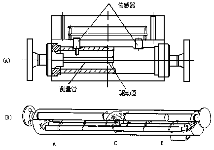 這種流量計的結構如圖22所示,驅動器放在直管部分的中間位置,當管中流體以一定速度流動時,由于驅動器的振動作用,使管子分開或靠近。