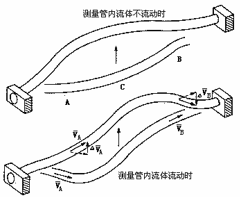 當測量管中流體以速度V在管中流動時,由于受到C點振動力的影響(此時的振動力是向上的),流體質點從A點運動到C點時被加速,質點產生反作用力F1,使管子向上運動速度減慢;而在C點到B點之間,流體質點被減速,使管子向上的運動速度加快。結果在C點兩邊的這兩個方向相反的力使管子產生一個變形,這個變形的相位差與測管中流體流過的質量流量成正比。