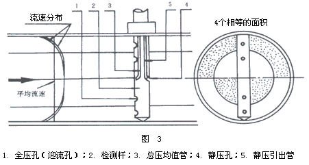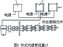 2 均速管的流量計的系統(tǒng)組成 如式(2)和式(3)所示。均速管流量計系統(tǒng)的組成實質(zhì)是對差壓△P的測量,這是所有差壓式流量計的共性,技術(shù)是通用的,即采用差壓變送器把△P轉(zhuǎn)換成相應(yīng)的機械信號或電信號,也可直接測量△p并進行相應(yīng)處理,本文不再詳述。 3 均速管的結(jié)構(gòu)形式 均速管的結(jié)構(gòu)是一根中空的金屬桿,其剖面形狀應(yīng)用最多的產(chǎn)品是圓形及菱形,80年代中期也采用過機翼形截面。 圓形截面的均速管,當(dāng)雷諾數(shù)Re處于105至106之間時,使得流量系數(shù)α不穩(wěn)定,它的穩(wěn)定區(qū)域是在雷諾數(shù)Re<105和Re>106。這主要是由于圓形截面的阻力件,自身存在著“阻力危機”而引起的。流體流經(jīng)圓管時存在著分離點不同而導(dǎo)致圓管在迎流流體時,在圓管上引起的壓力分布不同,從而引起了流量系數(shù)α的變化。菱形截面的均速管,就是為了克服圓形截面這一流量系數(shù)不穩(wěn)定區(qū)而設(shè)計的。菱形截面無論雷諾數(shù)的數(shù)值Re是多少,其分離點都是確 定不變的,從而較好地解決了均速管流量傳感器在檢測氣體、蒸汽流量時不穩(wěn)定區(qū)的困難。均速管截面采用菱形,已經(jīng)被人們所共認(rèn)。 機翼形截面是為了進一步減少流體通過檢測桿時迎流阻力,從而減小壓力損失。其實,就均速管而言,不論采用圓形還是菱形橫截面,其不可恢復(fù)的壓力損失,都是微不足道的,僅占輸出差壓的2%左右,但在實際應(yīng)用過程中,均速管的輸出差壓△P較低是它的一大弱點,當(dāng)采用機翼形橫截面時確實可以減小一些阻力,但是其輸出差壓更小,和圓形截面或菱形截面相比差壓減少了50%,由于差壓的過低,工作起來必須采用配套的較為昂貴的微差壓變送器,在這種情況下工作,使得檢測不穩(wěn)定,從而影響了它的推廣應(yīng)用。 4 應(yīng)用過程中對測量精度有影響的因素 均速管流量計在應(yīng)用過程中應(yīng)注意的問題,請參閱國家計量檢定規(guī)程JJG640-94差壓式流量計檢定規(guī)程及相關(guān)文獻,本文不再詳述。 5 結(jié)束語 應(yīng)該指出,均速管流量計從設(shè)計、制造到安裝使用,都要求十分嚴(yán)格,只要其中一個環(huán)節(jié)稍加不慎,就可造成很大誤差。 準(zhǔn)確測量流量是任何生產(chǎn)部門都需要的,也是任何部門普遍關(guān)心的問題。均速管流量計要想在今后的計測應(yīng)用中發(fā)揮自己的作用,提高流量測量的水平是有路可走的。熱式均速管流量計就是其中的一個途徑,如圖5所示。 熱式均速管流量計由三部分組成,檢測桿、電子線路和流量的顯示與積算。檢測桿是一根中空的金屬管,并在其上配置了若干熱絲感測元件。電子線路相應(yīng)地和每一只熱絲感測元件組合,相當(dāng)于一臺熱絲測速計。熱式均速管流量計的流量計算式為 (5)式中; A——管道橫截面面積,m2n——管道截面的等分?jǐn)?shù);ρi——第i個特征點處的密度,kg/m3;υi——第i個特征點處的流速,m/s;質(zhì)量流速(pυ)的計算式為 (6) 式中:I為加熱電流;R為熱絲電阻;T為熱絲感測元件溫度;T0為氣體溫度;ρ為被測介質(zhì)密度;υ為流體流速:α1,α2 ,m為經(jīng)驗常數(shù)。