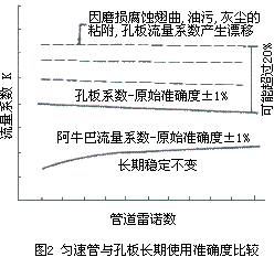 均速管流量計的測量元件——均速管(國外稱Annubar,直譯阿牛巴),是基于早期皮托管測速原理發(fā)展起來的,是60年代后期開發(fā)的一種新型差壓流量測量元件,并開始應(yīng)用與我國的工業(yè)現(xiàn)場,70年代中期已有30余家廠家進行了研制生產(chǎn)。均速管的優(yōu)點是;結(jié)構(gòu)上較為簡單(如圖1所示),壓力損失小,安裝、拆卸方便,維護量小。 該流量計由于生產(chǎn)成本低,價格低廉,因此在市場較為暢銷,在眾多的流量儀表中占有了一席之地。特別是由于其壓力損失小(與孔板相比較,僅為孔板的5%以下),大大減少了動力消耗,節(jié)能效果顯著,這在能源緊張的今天,有著其特殊的意義。由于該流量計適應(yīng)范圍寬,長期穩(wěn)定性好(如圖2所示)近年來有了較大的發(fā)展,出現(xiàn)了幾種結(jié)構(gòu)形式不同的流量計。但因使用不當(dāng),在應(yīng)用中產(chǎn)生了一些問題,使得客觀要求與發(fā)展現(xiàn)狀產(chǎn)生了很大的矛盾,許多人期望其應(yīng)用問題能得到解決,為此人們做了大量的不懈努力,使得均速管流量計這一既古老而又年輕的流量計,在能源、環(huán)保等計量測試中得到了較為廣泛的應(yīng)用。 1 均速管流量傳感器的測量原理 均速管流量傳感器,由其結(jié)構(gòu)示意圖所知,它是一根沿直徑插入管道中的中空金屬桿,在迎向流體流動方向有成對的測壓孔,一般說來是兩對,但也有一對或多對的,其外形似笛。迎流面的多點測壓孔測量的是總壓,與全壓管相連通,引出平均全壓p1,背流面的中心處一般開有一只孔,與靜壓管相通,引出靜壓p2。均速管是利用測量流體的全壓與靜壓之差來測量流速的。均速管的輸出差壓(△p)和流體平均速度(v),可根據(jù)經(jīng)典的伯努利方程得出 (1)式中; △P——全壓與靜壓之差,Paρ——流體密度,kg/m3k——校正系數(shù)。如果用流量來表示,其流量計算基本公式為式中 qv ——流體的體積流量,m3/s;qm——流體的質(zhì)量流量,kg/s;α ——工作狀態(tài)下均速管的流量系數(shù);ε——工作狀態(tài)下流體流過檢測桿時的流束膨脹系數(shù);A——工作狀態(tài)下管道內(nèi)截面面積,m2對于不同壓縮性流體:ε=1; 對于可壓縮性流體:ε<1 全壓孔的位置,可按等分面積法求取。這樣,在流量變化的情況下均速管能有較好的適應(yīng)能力,所反映的誤差較小。所謂等分面積法,就是將管道截面分割成內(nèi)圓和外環(huán)的等效平均流速點,這些點就是全壓孔的位置,如圖3所示。 全壓孔的開孔位置可用切比雪夫數(shù)值積分的解法求得,如圖4所示,圖中r1=±0.4597R,r2=±0.8881R,r1,r2為取壓孔中心距管道中心的距離,R為管道內(nèi)半徑。 對于這種選點方法,無論是數(shù)目還是位置,近年來學(xué)術(shù)界及國際標(biāo)準(zhǔn)化組織均提出了異議,認(rèn)為管內(nèi)的流動應(yīng)分為三個區(qū)域,選點按對數(shù)——切比雪夫(Log-Jchebycheff)法進行,因此,總壓檢測孔的位置應(yīng)為;r1=±0.03754R;r2=±0.7252R;r3=±0.9358R。這種方法已被國際標(biāo)準(zhǔn)化組織(ISO)封閉管道中的流量測量委員會(TC30)所確認(rèn),鑒于上述原因,通過人們的試驗研究,均速管的總壓孔數(shù)目還是建議采用二對或三對為宜。 背壓檢測孔長期以來采用一個,是由于人們已經(jīng)認(rèn)識到均速管按規(guī)范是處于位勢流中,而位勢流的前題是管道橫截面上各點靜壓均相等,沒有橫向流動。從這個角度來看,一個背壓檢測孔已足夠,為了防止流體的流量在檢測過程中阻塞背壓檢測孔,多孔的背壓取壓,已開始應(yīng)用在均速管流量傳感器上,總之,由流量的基本公式可知,只要有效地測出均速管的輸出差壓△P,就可測出流體的流量值,這就是均速管流量傳感器的測量原理。