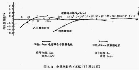 使用電磁流量計(jì)的前提是被測液體必須是導(dǎo)電的,不能低于閾值(即下限值)。電導(dǎo)率低于閾值會產(chǎn)生測量誤差直至不能使用,超過閾值即使變化也可以測量,示值誤差變化不大,通用型EMF的閾值在10-4~(5×10-6)S/cm之間,視型號而異。使用時(shí)還取決于傳感器和轉(zhuǎn)換器間流量信號線長度及其分布電容,制造廠使用說明書中通常規(guī)定電導(dǎo)率相對應(yīng)的信號線長度。非接觸電容耦合大面積電極的儀表則可測電導(dǎo)率低至5×10-8S/cm的液體。